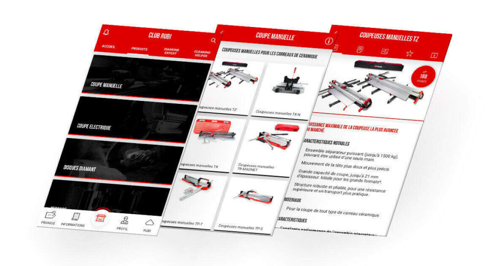 Vous pouvez maintenant trouver l’ensemble de l’univers de construction dans une seule application, vous donnant un accès rapide et facile à toutes les informations dont vous avez besoin en tant que carreleur professionnel Le Club RUBI APP a réuni les 3 applications, “Cleaning assistant”, “Diamond Expert” et le catalogue RUBI en une seule ! Faites-vous une faveur !