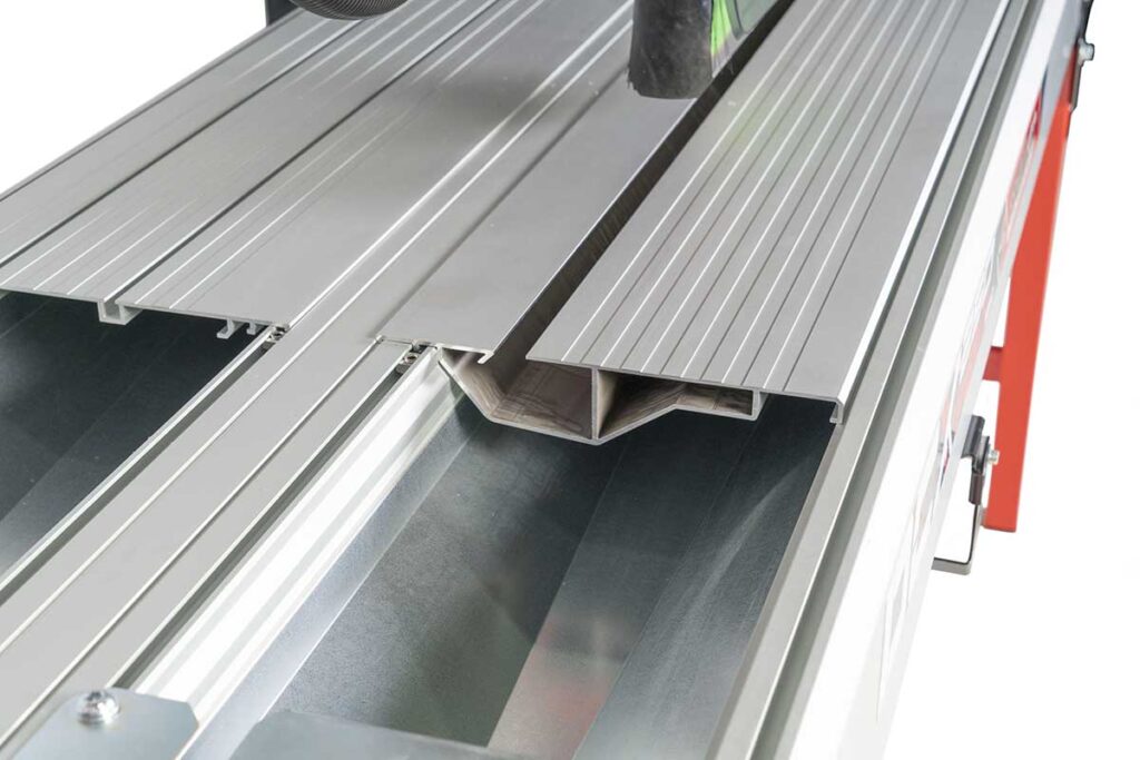 Het zaagsysteem is ook voorzien van een stabiele invalmogelijkheid. Hierdoor kan de zaaghoogte worden aangepast aan de behoeften van de gebruiker. De hoekinstelling van de aluminium aanslag kan van 0° tot 60° worden ingesteld voor repeterende zaagsneden.